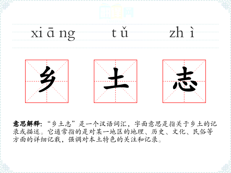 “乡土志”这个词不仅是一个记录工具,更是一种文化传承的象征。它提醒我们珍视和保护地方特色,同时也是连接过去与现在的桥梁。在语言学*和表达中,理解和运用“乡土志”这样的词汇,有助于我们更深刻地把握文化的多样性和历史的深度。