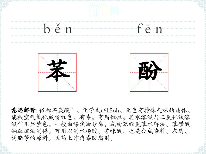 1.俗称石炭酸”。化学式c6h5oh。无色有特殊气味的晶体。能被空气氧化成粉红色。有毒。有腐蚀性。其水溶液与三氯化铁溶液作用显紫色。一般由煤焦油分离,或由苯经氯苯水解法、苯磺酸钠碱熔法制得。可用以制水杨酸、苦味酸,也是合成染料、农药、树脂等的原料。医药上作消毒防腐剂。