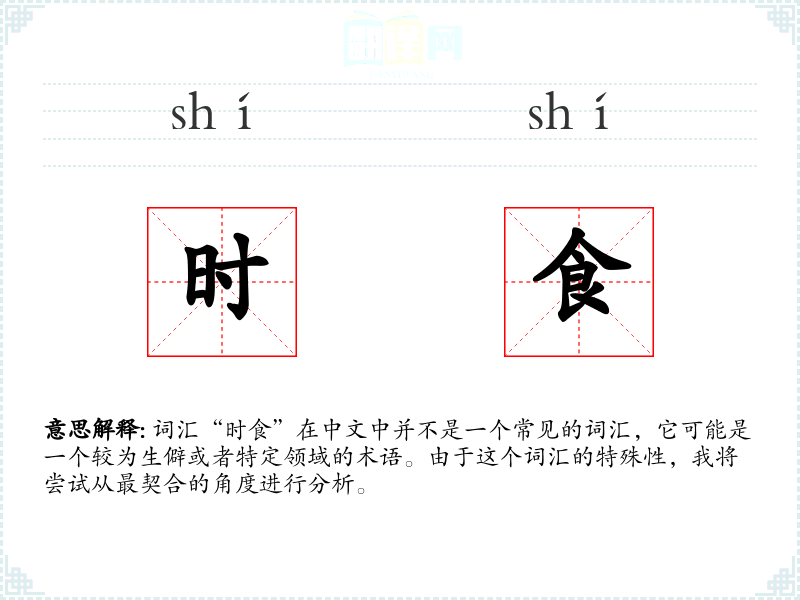 词汇“时食”在中文中并不是一个常见的词汇,它可能是一个较为生僻或者特定领域的术语。由于这个词汇的特殊性,我将尝试从最契合的角度进行分析。