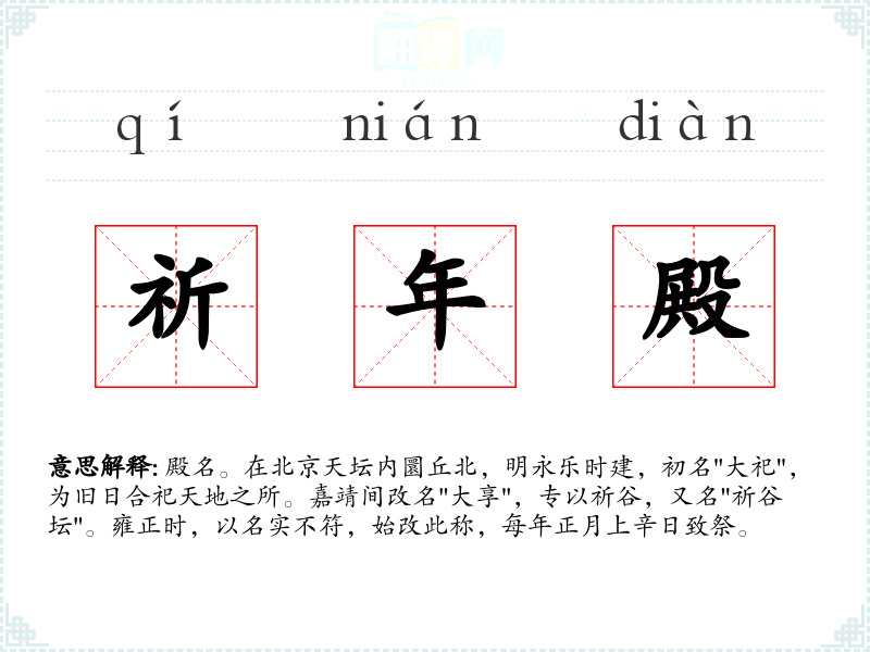 殿名。在北京天坛内圜丘北,明永乐时建,初名"大祀",为旧日合祀天地之所。嘉靖间改名"大享",专以祈谷,又名"祈谷坛"。雍正时,以名实不符,始改此称,每年正月上辛日致祭。