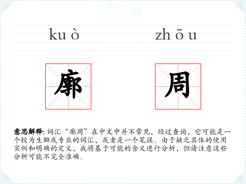 词汇“廓周”在中文中并不常见,经过查询,它可能是一个较为生僻或专业的词汇,或者是一个笔误。由于缺乏具体的使用实例和明确的定义,我将基于可能的含义进行分析,但请注意这些分析可能不完全准确。