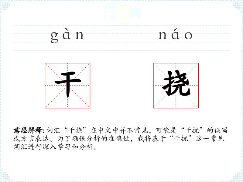 词汇“干挠”在中文中并不常见,可能是“干扰”的误写或方言表达。为了确保分析的准确性,我将基于“干扰”这一常见词汇进行深入学*和分析。