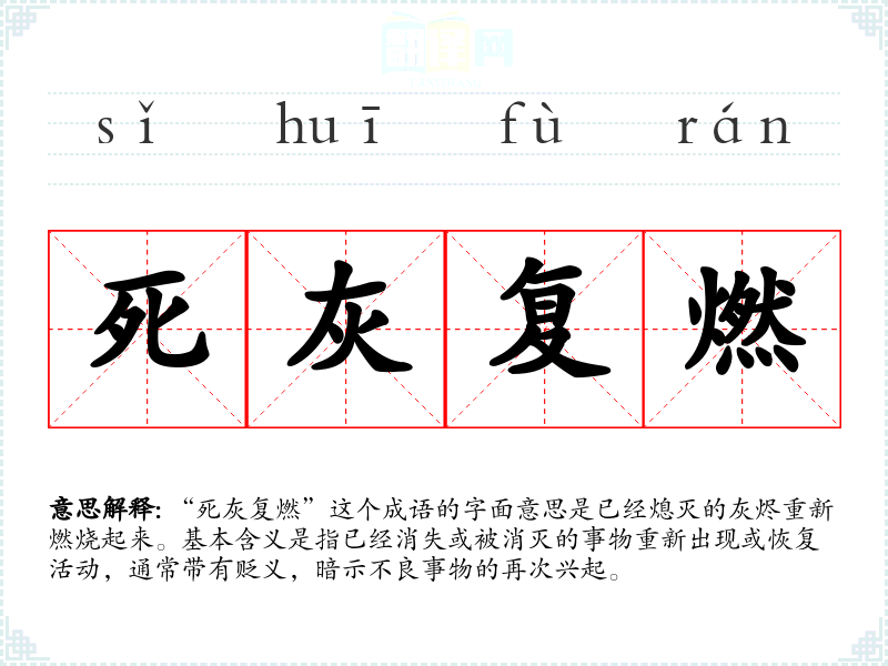 “死灰复燃”这个成语的字面意思是已经熄灭的灰烬重新燃烧起来。基本含义是指已经消失或被消灭的事物重新出现或恢复活动,通常带有贬义,暗示不良事物的再次兴起。