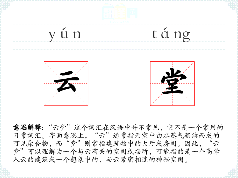 “云堂”这个词汇的词源并不明确,它可能是由“云”和“堂”两个字组合而成的新词,用于特定的文学或艺术创作中,以表达一种超脱现实的意境。