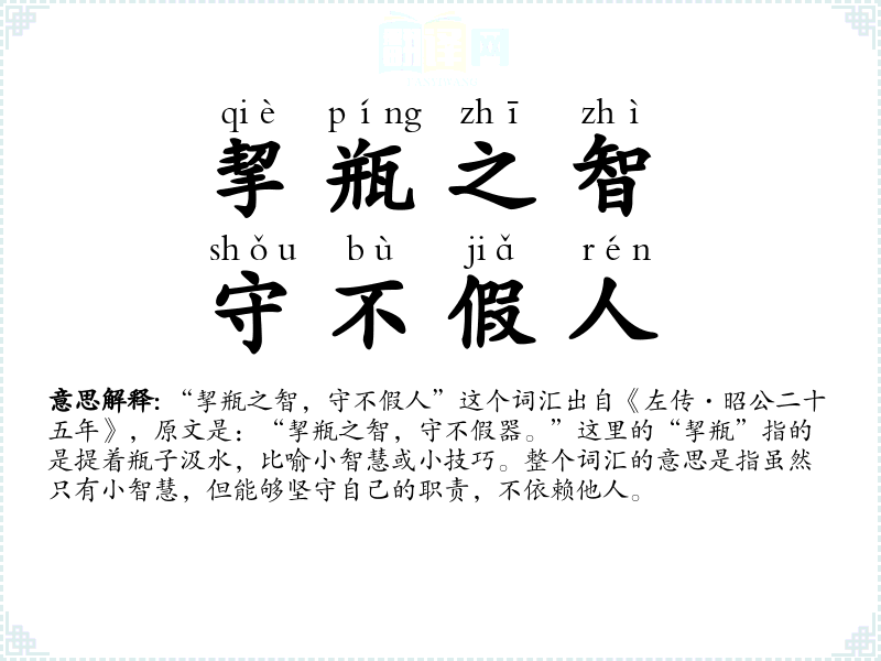 “挈瓶之智,守不假人”这个词汇出自《左传·昭公二十五年》,原文是:“挈瓶之智,守不假器。”这里的“挈瓶”指的是提着瓶子汲水,比喻小智慧或小技巧。整个词汇的意思是指虽然只有小智慧,但能够坚守自己的职责,不依赖他人。