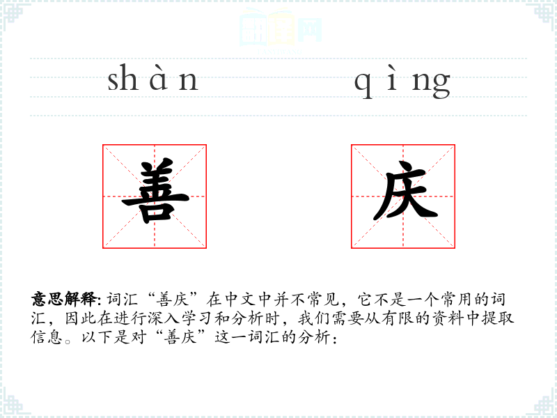 词汇“善庆”在中文中并不常见,它不是一个常用的词汇,因此在进行深入学*和分析时,我们需要从有限的资料中提取信息。以下是对“善庆”这一词汇的分析: