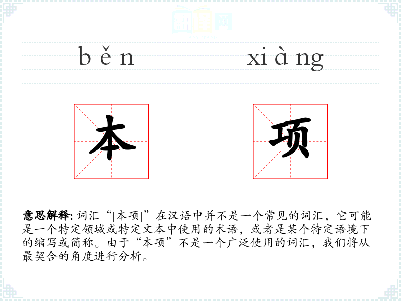 词汇“[本项]”在汉语中并不是一个常见的词汇,它可能是一个特定领域或特定文本中使用的术语,或者是某个特定语境下的缩写或简称。由于“本项”不是一个广泛使用的词汇,我们将从最契合的角度进行分析。