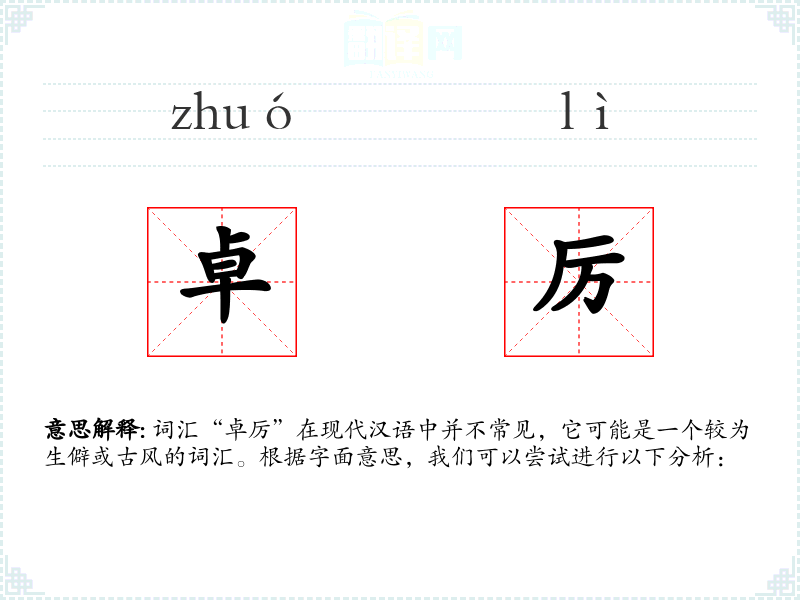 词汇“卓厉”在现代汉语中并不常见,它可能是一个较为生僻或古风的词汇。根据字面意思,我们可以尝试进行以下分析: