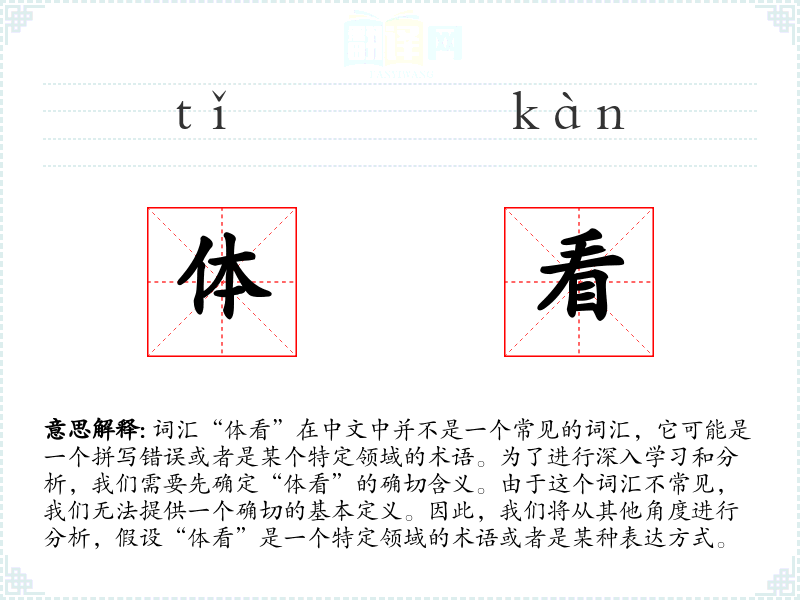 词汇“体看”在中文中并不是一个常见的词汇,它可能是一个拼写错误或者是某个特定领域的术语。为了进行深入学习和分析,我们需要先确定“体看”的确切含义。由于这个词汇不常见,我们无法提供一个确切的基本定义。因此,我们将从其他角度进行分析,假设“体看”是一个特定领域的术语或者是某种表达方式。
