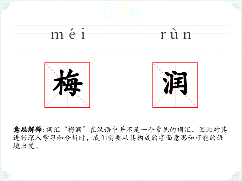 词汇“梅润”在汉语中并不是一个常见的词汇,因此对其进行深入学*和分析时,我们需要从其构成的字面意思和可能的语境出发。