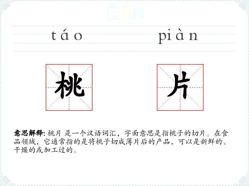桃片 这个词由“桃”和“片”两个字组成。桃在*文化中有着悠久的历史,象征着长寿和繁荣。片字则表示片或片段,组合起来即指桃子的切片。