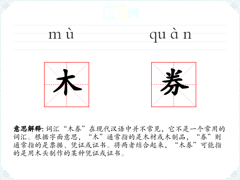 - 理解:“木券”是一个具有历史和文化意义的词汇,虽然在现代社会中不常见,但它反映了人类社会早期的一种交易和凭证方式。