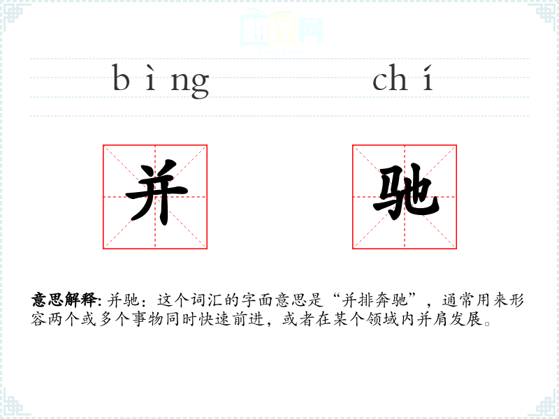 并驰:这个词汇的字面意思是“并排奔驰”,通常用来形容两个或多个事物同时快速前进,或者在某个领域内并肩发展。