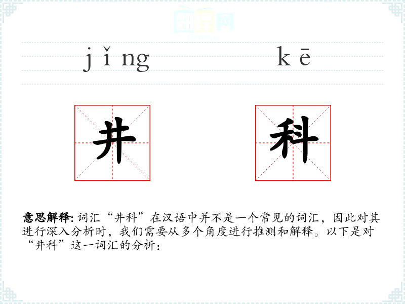 词汇“井科”在汉语中并不是一个常见的词汇,因此对其进行深入分析时,我们需要从多个角度进行推测和解释。以下是对“井科”这一词汇的分析: