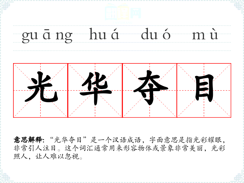 “光华夺目”是一个汉语成语,字面意思是指光彩耀眼,非常引人注目。这个词汇通常用来形容物体或景象非常美丽,光彩照人,让人难以忽视。