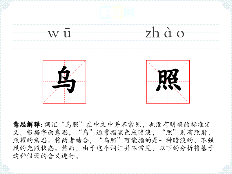 词汇“乌照”在中文中并不常见,也没有明确的标准定义。根据字面意思,“乌”通常指黑色或暗淡,“照”则有照射、照耀的意思。将两者结合,“乌照”可能指的是一种暗淡的、不强烈的光照状态。然而,由于这个词汇并不常见,以下的分析将基于这种假设的含义进行。
