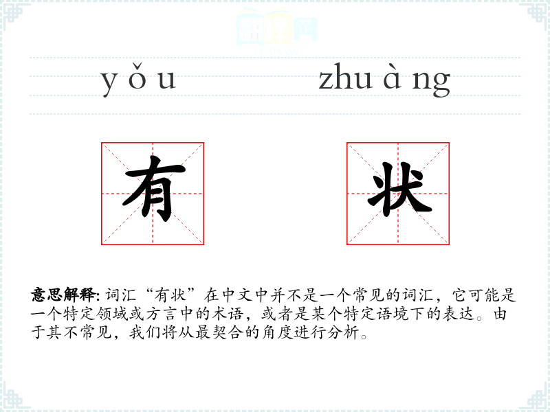 由于“有状”不是一个标准词汇,它在不同语境下的使用可能非常有限。在某些方言或特定领域中,它可能用来描述某人或某物的特定状态或情况。