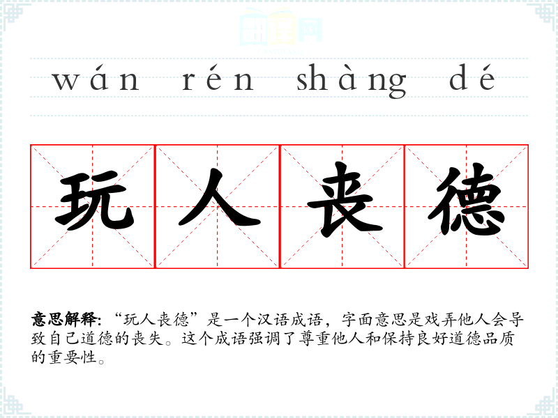 “玩人丧德”是一个汉语成语,字面意思是戏弄他人会导致自己道德的丧失。这个成语强调了尊重他人和保持良好道德品质的重要性。