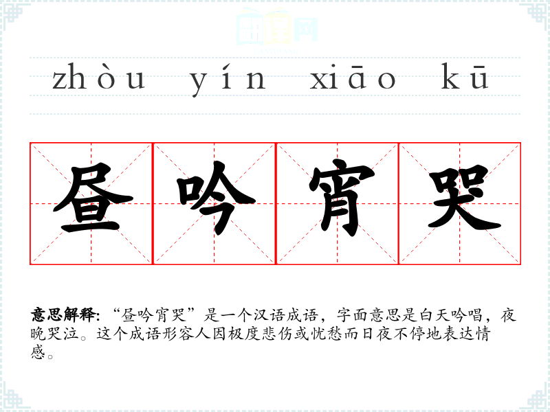 在文学作品中,“昼吟宵哭”常用来描绘主人公因失去亲人、爱情或理想而陷入深深的悲痛之中。在口语中,这个成语可能用来形容某人因长期的不幸或压力而表现出极端的情绪状态。在专业领域,如心理学,这个成语可能用来描述一种情绪失调的状态。