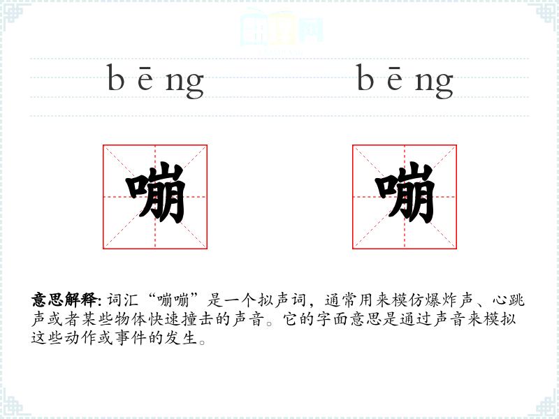 词汇“嘣嘣”是一个拟声词,通常用来模仿爆炸声、心跳声或者某些物体快速撞击的声音。它的字面意思是通过声音来模拟这些动作或**的发生。