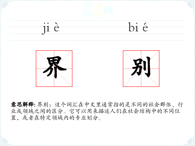 界别:这个词汇在中文里通常指的是不同的社会群体、行业或领域之间的区分。它可以用来描述人们在社会结构中的不同位置,或者在特定领域内的专业划分。