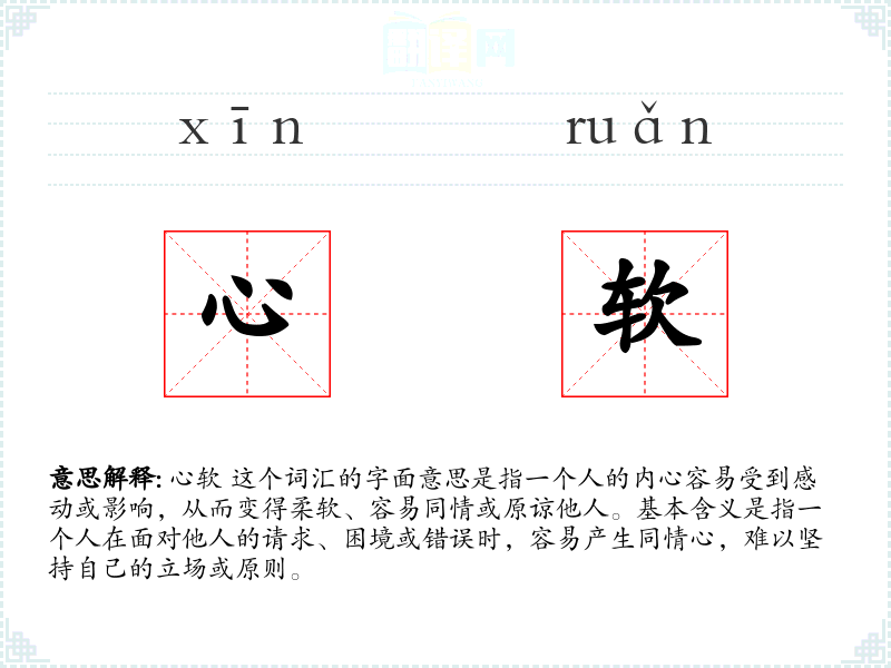 心软 这个词汇的字面意思是指一个人的内心容易受到感动或影响,从而变得柔软、容易同情或原谅他人。基本含义是指一个人在面对他人的请求、困境或错误时,容易产生同情心,难以坚持自己的立场或原则。