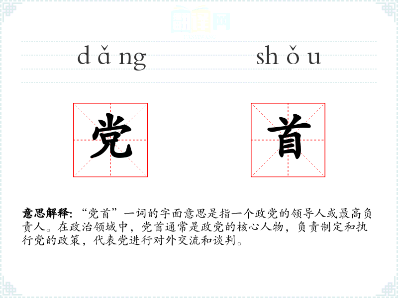“党首”一词源于汉语,其中“党”指政党,“首”指领导或首领。随着政治体制的发展,这个词在现代汉语中被广泛使用,用以指代政党的最高领导人。