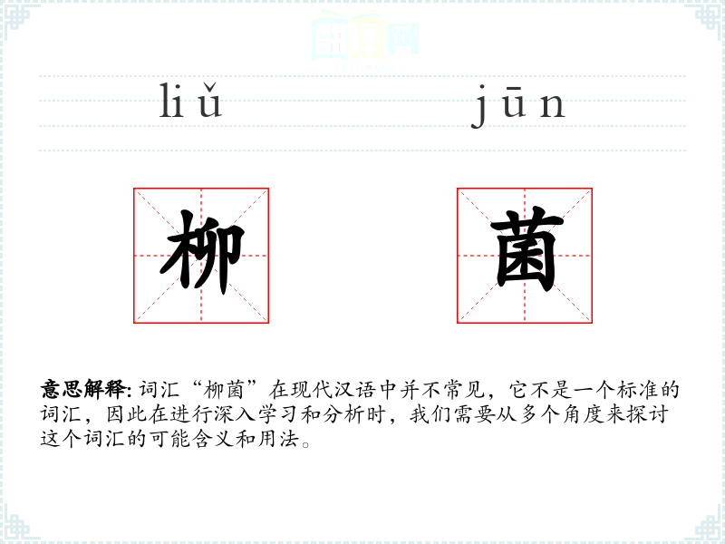 “柳菌”字面意思可能是指生长在柳树上的菌类。柳指的是柳树,菌则是指真菌类生物。然而,这个词汇在标准汉语词典中并未收录,因此其确切含义可能需要结合具体语境来解释。