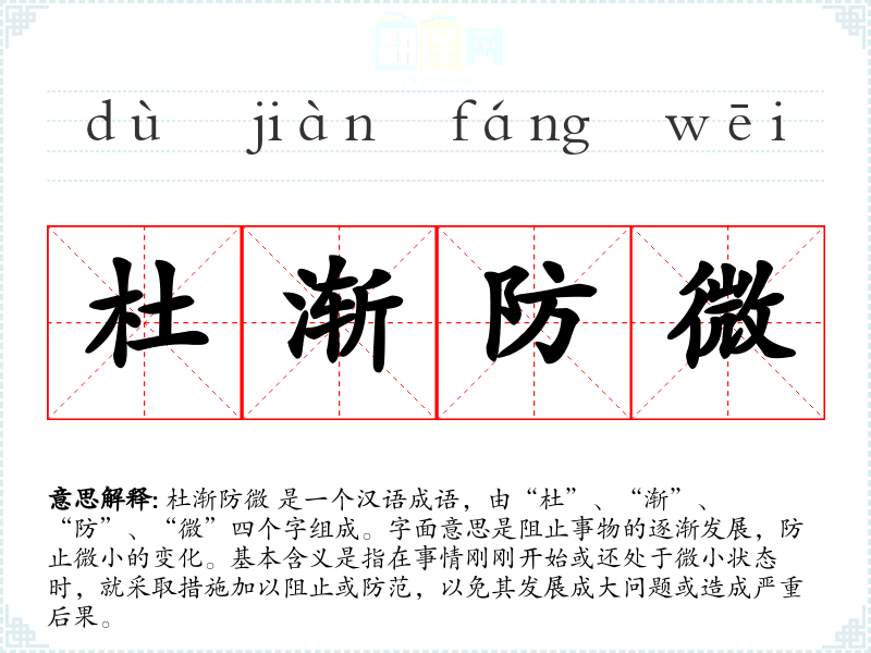 杜渐防微 是一个汉语成语,由“杜”、“渐”、“防”、“微”四个字组成。字面意思是阻止事物的逐渐发展,防止微小的变化。基本含义是指在事情刚刚开始或还处于微小状态时,就采取措施加以阻止或防范,以免其发展成大问题或造成严重后果。