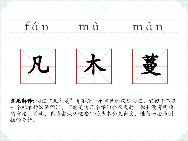 词汇“凡木蔓”并不是一个常见的汉语词汇,它似乎不是一个标准的汉语词汇,可能是由几个字组合而成的,但并没有明确的意思。因此,我将尝试从这些字的基本含义出发,进行一些推测性的分析。