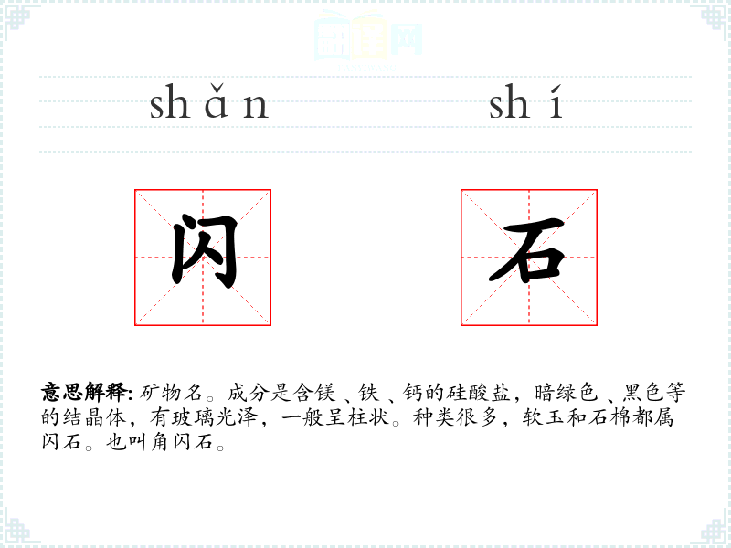 矿物名。成分是含镁﹑铁﹑钙的硅酸盐,暗绿色﹑黑色等的结晶体,有玻璃光泽,一般呈柱状。种类很多,软玉和石棉都属闪石。也叫角闪石。