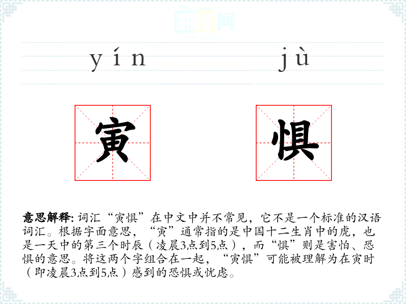 词汇“寅惧”在中文中并不常见,它不是一个标准的汉语词汇。根据字面意思,“寅”通常指的是**十二生肖中的虎,也是一天中的第三个时辰(凌晨3点到5点),而“惧”则是害怕、恐惧的意思。将这两个字组合在一起,“寅惧”可能被理解为在寅时(即凌晨3点到5点)感到的恐惧或忧虑。