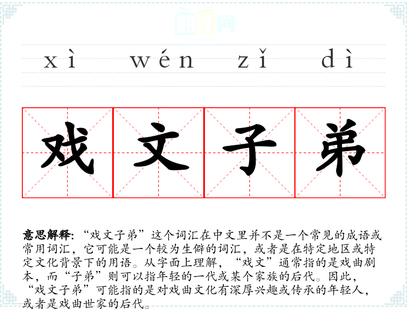 由于“戏文子弟”不是一个常见的词汇,它在不同的语境下可能会有不同的解释。在文学作品中,它可能用来形容那些对传统文化有深厚情感的年轻人;在口语中,如果某个地区有深厚的戏曲文化,这个词汇可能会被用来指代那些从小接触戏曲并对此有特殊情感的年轻人。