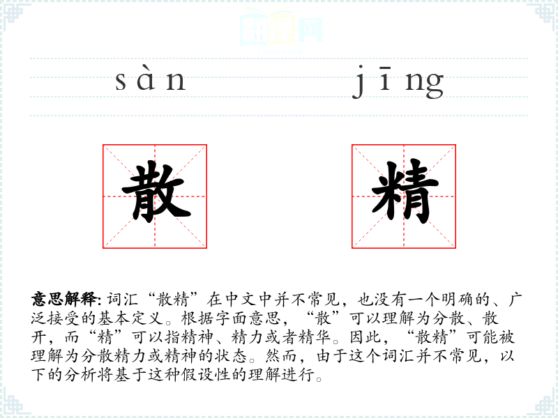 词汇“散精”在中文中并不常见,也没有一个明确的、广泛接受的基本定义。根据字面意思,“散”可以理解为分散、散开,而“精”可以指精神、精力或者精华。因此,“散精”可能被理解为分散精力或精神的状态。然而,由于这个词汇并不常见,以下的分析将基于这种假设性的理解进行。