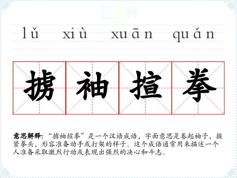 在文学作品中,“掳袖揎拳”常用来描绘人物的愤怒或决心,增强情节的紧张感。在口语中,这个成语可能用来形容某人准备做某事时的积极态度或决心。在专业领域,如体育或武术,这个成语可能用来描述**员或武术家的准备动作。