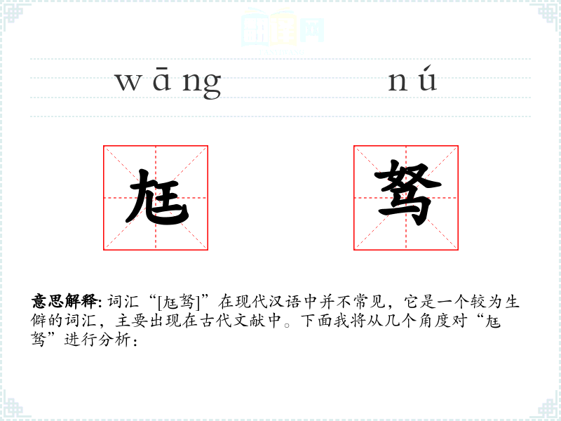 词汇“[尪驽]”在现代汉语中并不常见,它是一个较为生僻的词汇,主要出现在古代文献中。下面我将从几个角度对“尪驽”进行分析: