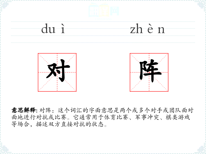 对阵:这个词汇的字面意思是两个或多个对手或团队面对面地进行对抗或比赛。它通常用于体育比赛、军事冲突、棋类游戏等场合,描述双方直接对抗的状态。