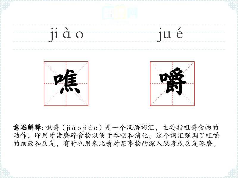 噍嚼(jiáo jiáo)是一个汉语词汇,主要指咀嚼食物的动作,即用牙齿磨碎食物以便于吞咽和消化。这个词汇强调了咀嚼的细致和反复,有时也用来比喻对某事物的深入思考或反复琢磨。
