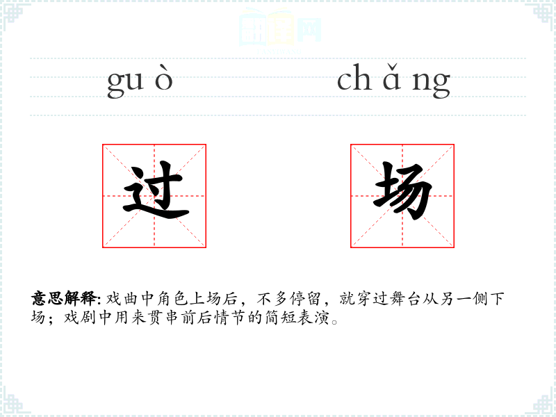 戏曲中角色上场后,不多停留,就穿过舞台从另一侧下场;戏剧中用来贯串前后情节的简短表演。