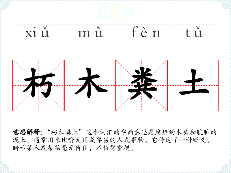 “朽木粪土”这个词汇的字面意思是腐烂的木头和肮脏的泥土,通常用来比喻无用或卑劣的人或事物。它传达了一种贬义,暗示某人或某物毫无价值,不值得重视。