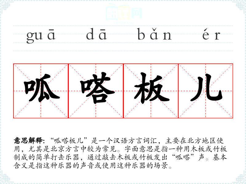 “呱嗒板儿”是一个汉语方言词汇,主要在北方地区使用,尤其是北京方言中较为常见。字面意思是指一种用木板或竹板制成的简单打击乐器,通过敲击木板或竹板发出“呱嗒”声。基本含义是指这种乐器的声音或使用这种乐器的场景。