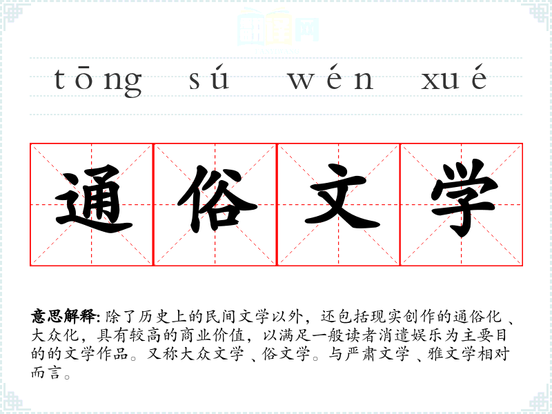 除了历史上的民间文学以外,还包括现实创作的通俗化﹑大众化,具有较高的商业价值,以满足一般读者消遣娱乐为主要目的的文学作品。又称大众文学﹑俗文学。与严肃文学﹑雅文学相对而言。