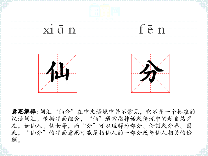 词源与演变: “仙分”这个词并没有明确的词源和历史演变记录,因为它不是一个标准词汇。它可能是现代文学创作中的一个新造词,用以表达特定的文学意境或概念。