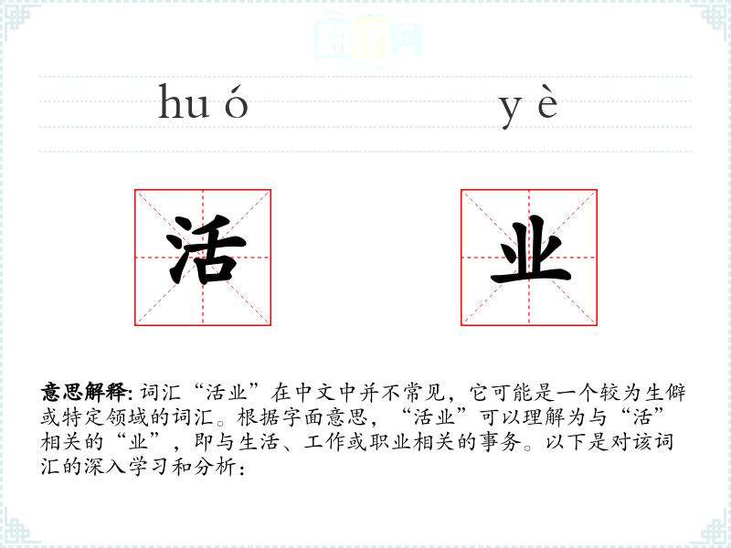词汇“活业”在中文中并不常见,它可能是一个较为生僻或特定领域的词汇。根据字面意思,“活业”可以理解为与“活”相关的“业”,即与生活、工作或职业相关的事务。以下是对该词汇的深入学习和分析: