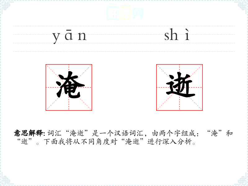 “淹”字古汉语中指水深而广,或指水覆盖;“逝”字古汉语中指离去、消失。两个字组合在一起,形成了描述水淹没并导致事物消失的含义。