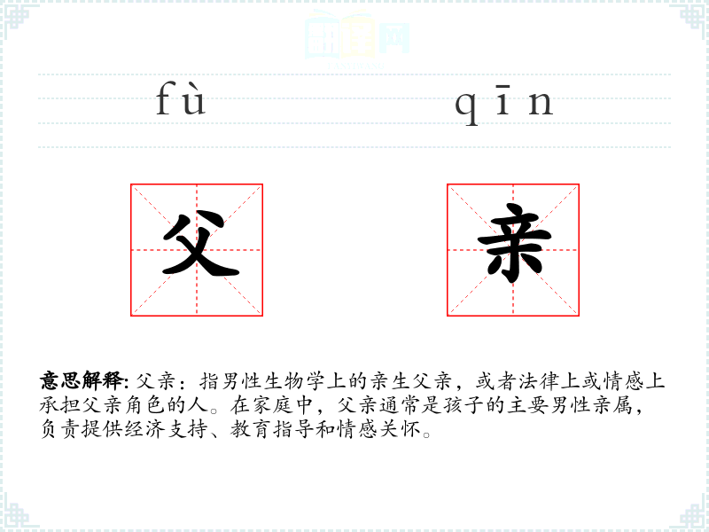 父亲:指男性生物学上的亲生父亲,或者法律上或情感上承担父亲角色的人。在家庭中,父亲通常是孩子的主要男性亲属,负责提供经济支持、教育指导和情感关怀。