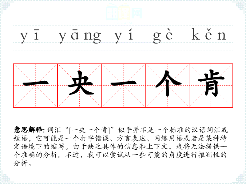 由于“[一央一个肯]”不是一个标准的词汇,我们无法给出一个确切的字面意思和基本含义。