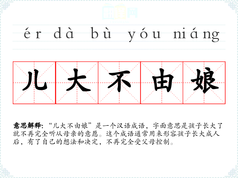 “儿大不由娘”是一个汉语成语,字面意思是孩子长大了就不再完全听从母亲的意愿。这个成语通常用来形容孩子长大成人后,有了自己的想法和决定,不再完全受父母控制。