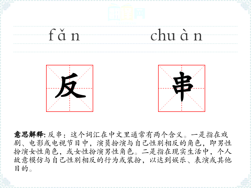反串:这个词汇在中文里通常有两个含义。一是指在戏剧、电影或电视节目中,演员扮演与自己性别相反的角色,即男性扮演女性角色,或女性扮演男性角色。二是指在现实生活中,个人故意模仿与自己性别相反的行为或装扮,以达到娱乐、表演或其他目的。