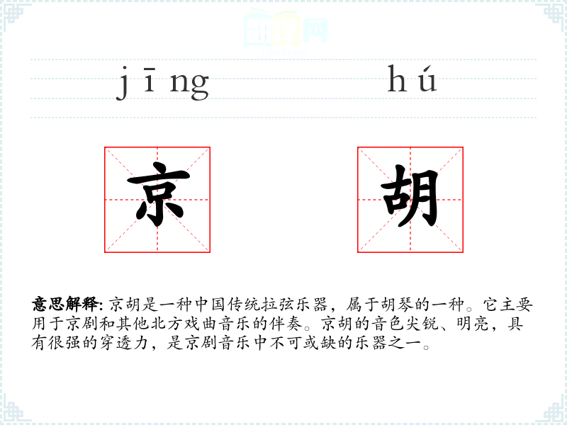 - 反义词:钢琴、吉他(这些西洋乐器与京胡在音色和使用场合上有明显差异)